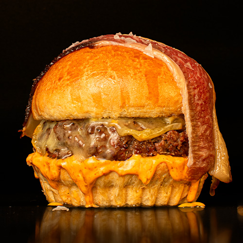 Pan brioche con aroma a trufa, patty ultrasmash, patty medallon cocinado al josper, x4 cheddar cremoso, salsa de chile dulce y cebolla caramelizada trufada.