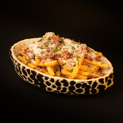 Patatas, mayonesa trufada, yema de huevo curada en soja, parmesano, bacon crunchy y cebollino