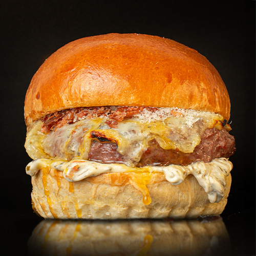 Carne de 200 gramos, salsa mayo trufa, queso scamorza, salsa de yema de huevo, parmesano en polvo y bacon crunchy