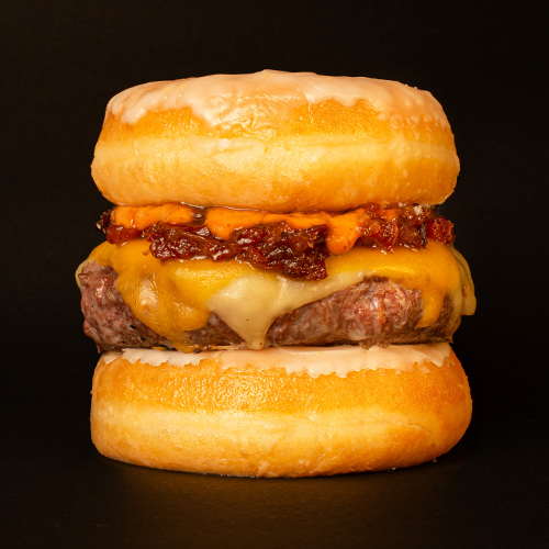 Dos dónuts caseros by Horno Vicente Ferrer, 180gr de rubia gallega, queso cheddar, queso gouda, mermelada de bacon y salsa Birmingham